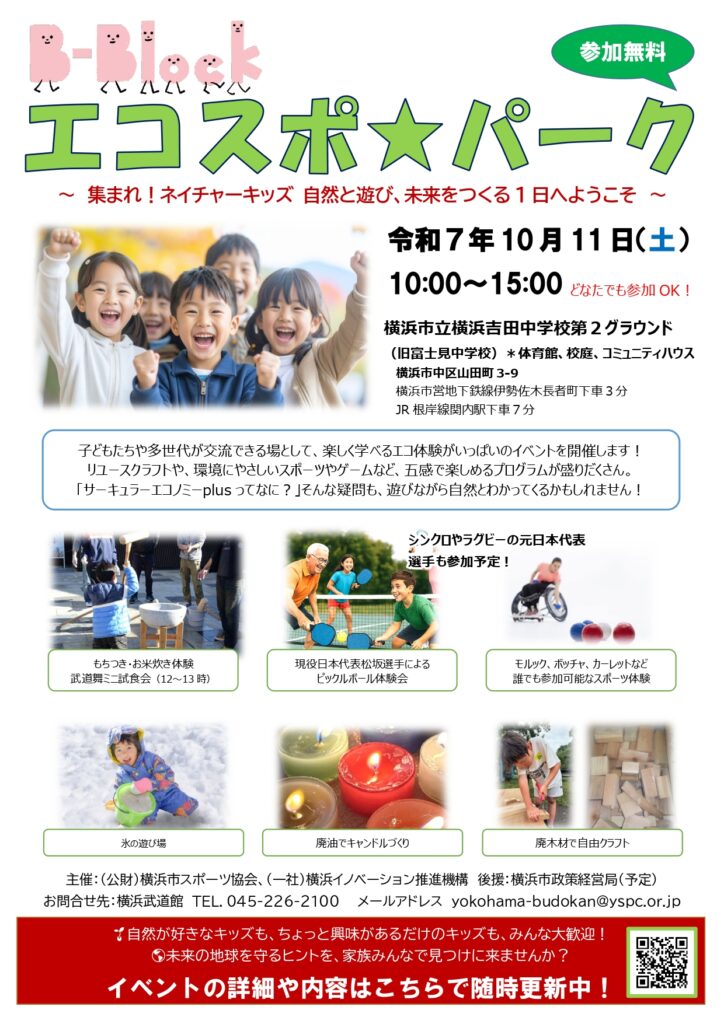横浜市中区の旧・富士見中学校(横浜吉田中学校 第2グラウンド)を舞台に、子どもから大人まで「エコ」と「スポーツ」を五感で体験するイベント「B-Blockエコスポ★パーク」を開催します。地域と学校、企業と若者がつながる実験的プログラムを展開する、「身近な“循環”を体で理解する1日」です。
