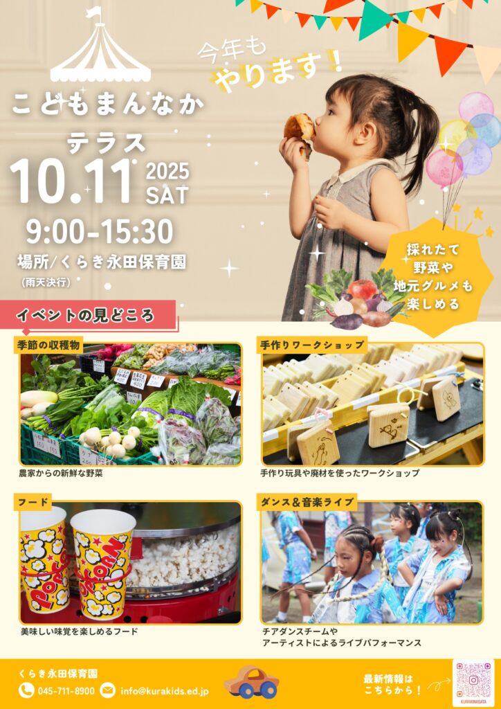 横浜市南区のくらき永田保育園(横浜市南区永田東2-5-8)で2025年10月11日(土)、「こどもまんなかテラス」が開催されます。10月11日(土)にBankPark YOKOHAMA(中区本町6)や旧富士見中学校(中区山田町3)で行うネイチャーキッズフェスタの連携企画になります。