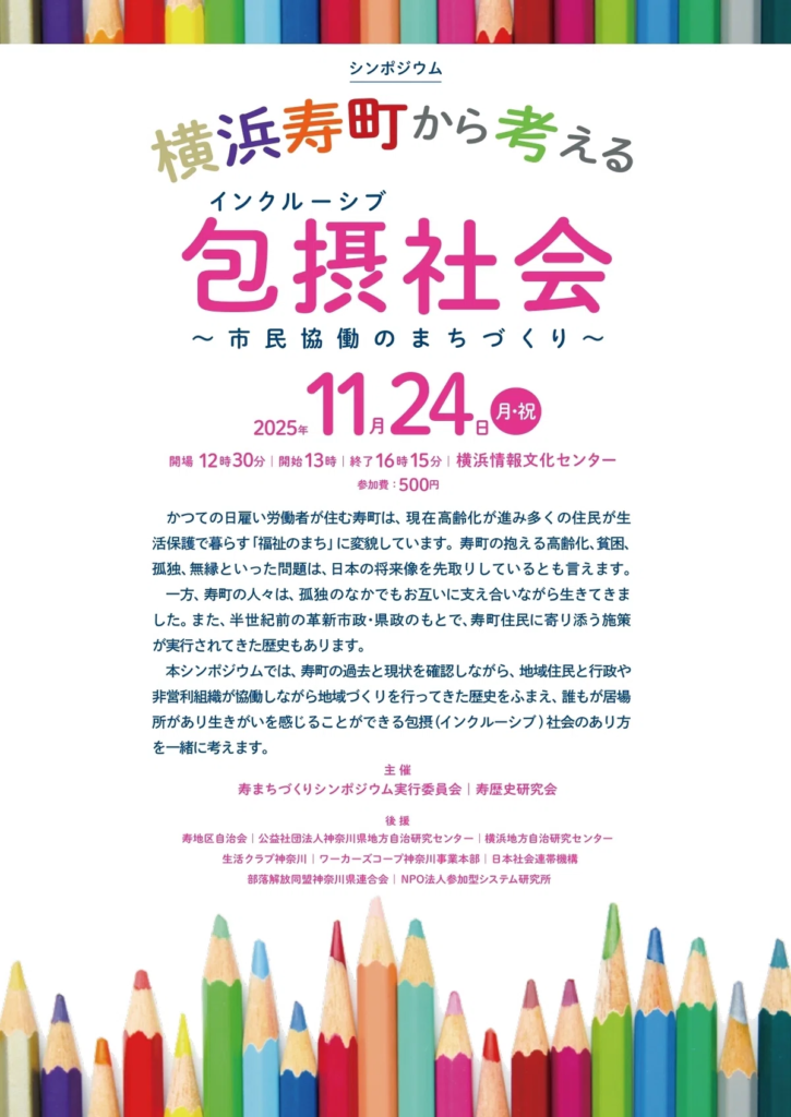 横浜の寿地区を題材に市民協働のあり方を考えるシンポジウム「横浜寿町から考える 包摂社会〜市民協働のまちづくり〜」が、2025年11月24日(月・祝)に開催されます。会場は横浜情報文化センター6階 情文ホール(横浜市中区日本大通11)で、時間は13時〜16時15分(開場12時30分)、参加費は500円です。