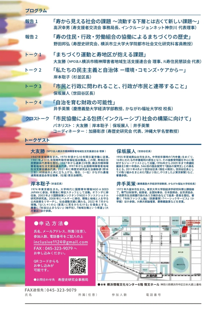 登壇者として、大友勝さん、岸本聡子さん(杉並区長)、保坂展人さん(世田谷区長)、井手英策さん(慶應義塾大学経済学部教授)が参加します。コーディネーターは加藤彰彦さん(寿歴史研究会 代表、沖縄大学名誉教授)です。