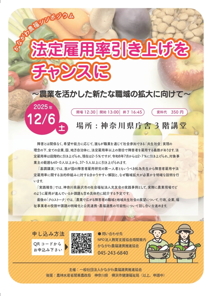 障害者の法定雇用率の引き上げと、農業を活用した新たな職域の拡大をテーマにしたシンポジウム「法定雇用率引き上げをチャンスに~農業を活かした新たな職域の拡大に向けて~」が、2025年12月6日に神奈川県庁舎3階講堂(横浜市中区日本大通1)で開催されます。