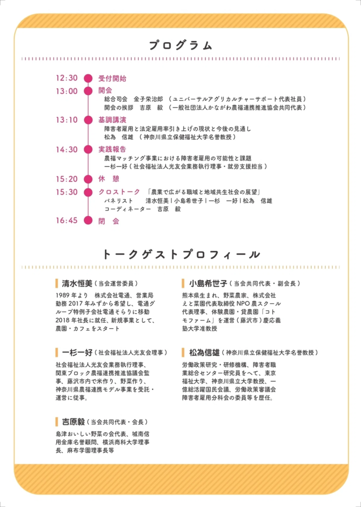 休憩を挟んだ後半のクロストーク「農業で広がる職域と地域共生社会の展望」では、農福連携の実務や政策に関わる登壇者が、それぞれの立場から意見を交わします。パネリストは、電通グループ特例子会社で農園・カフェ事業を立ち上げた清水恒美さん、野菜農家であり「えと菜園」社長でNPO法人「農スクール」代表理事の小島希世子さん、社会福祉法人光友会の一杉一好さん、基調講演も担当する松為信雄さんの4人です。コーディネーターは、一般社団法人「かながわ農福連携推進協会」共同代表で会長の吉原毅さんが務め、行政、企業、福祉事業者それぞれの役割や連携のポイント、地域での農福連携を広げるための課題と可能性を整理します。