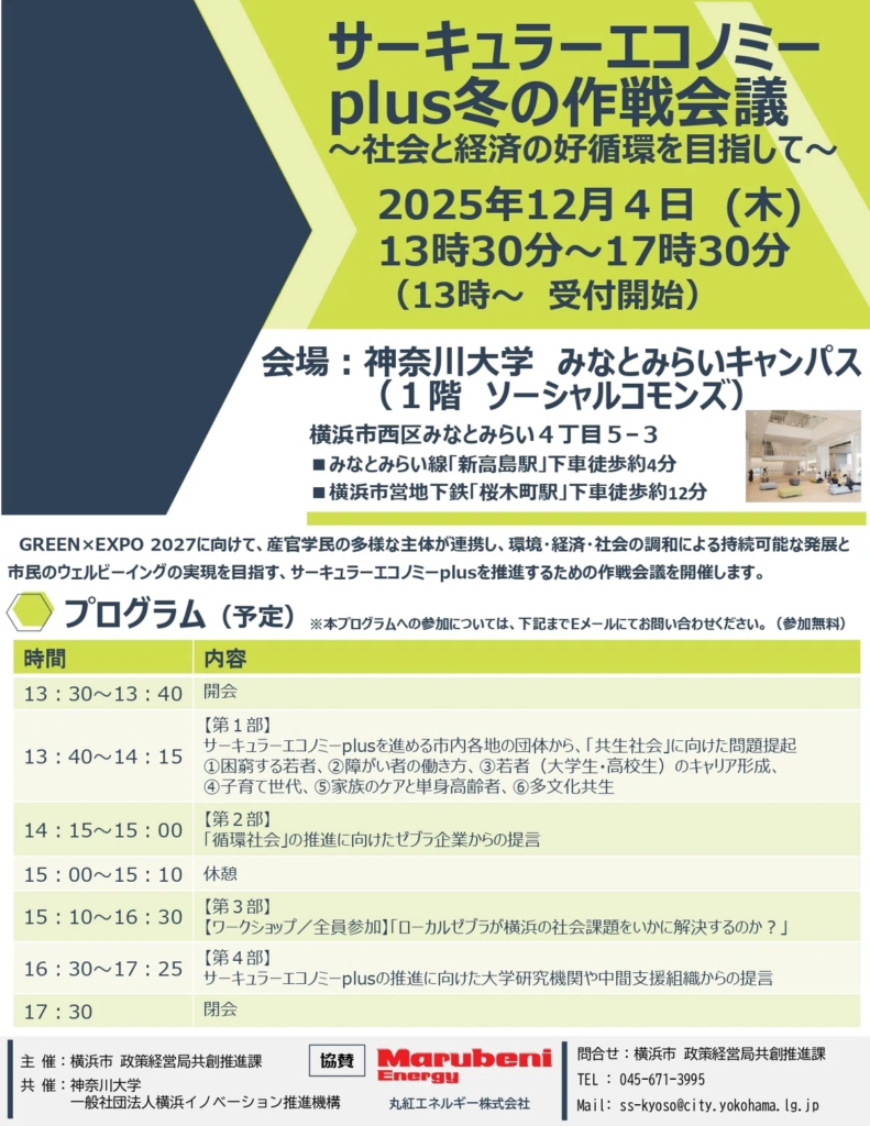 横浜市と神奈川大学などは、2025年12月4日に神奈川大学 みなとみらいキャンパス(横浜市西区みなとみらい4丁目5-3)で「サーキュラーエコノミーplus冬の作戦会議~社会と経済の好循環を目指して~」を開催します。GREEN×EXPO 2027を見据え、サーキュラーエコノミーplusの考え方をもとに、環境・経済・社会の調和と市民のウェルビーイングをテーマにした議論やワークショップを行う場です。会議は4部構成で、市内の実践団体やゼブラ企業、大学研究機関などが登壇し、横浜の地域課題に向き合う取り組みや今後の連携の方向性を共有します。