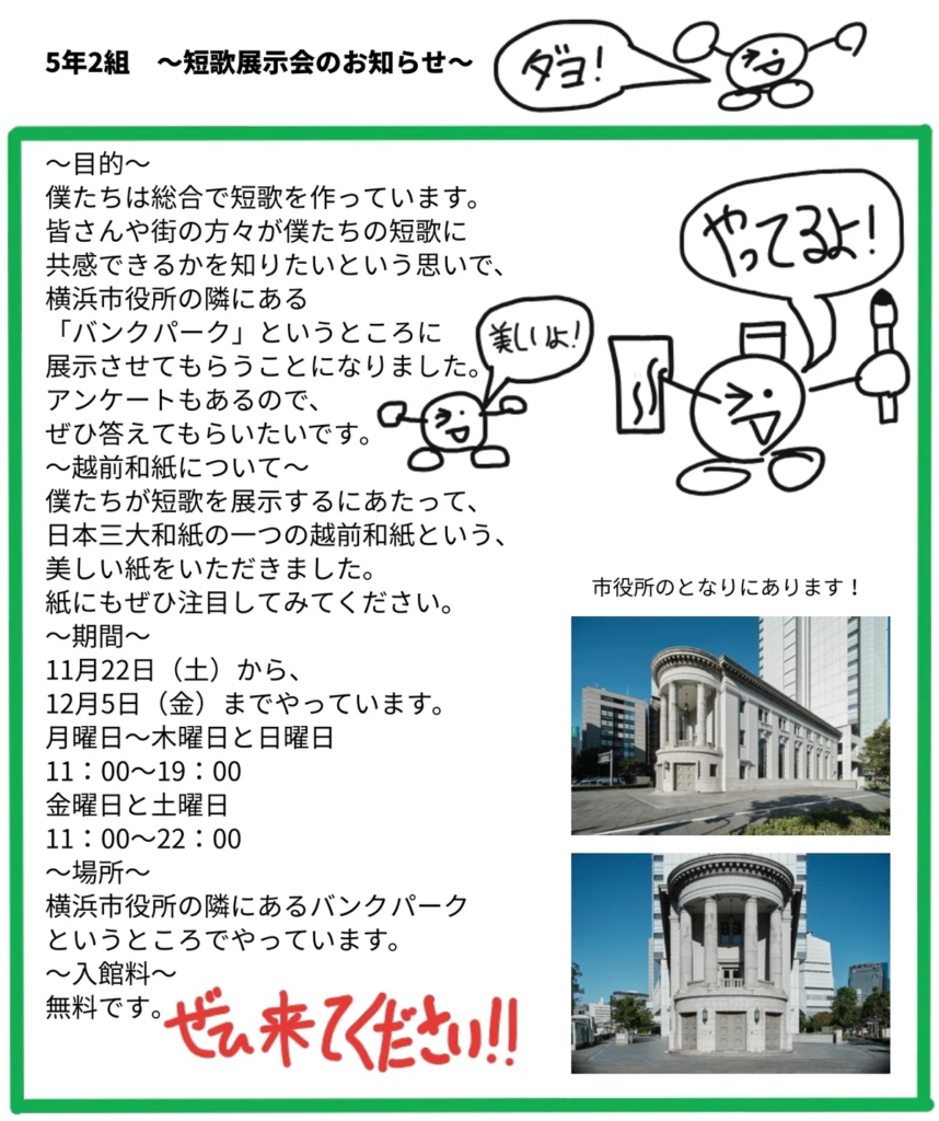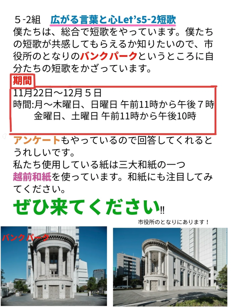 本町小5年2組短歌展でBankParkと街を結ぶ言葉