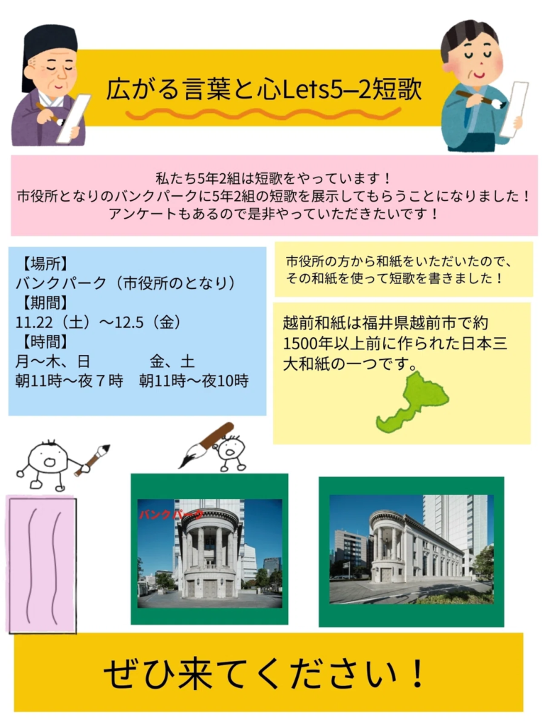 展示内容:本町小学校5年2組の児童がそれぞれの日常を詠んだ短歌34首を、越前和紙に書いて展示