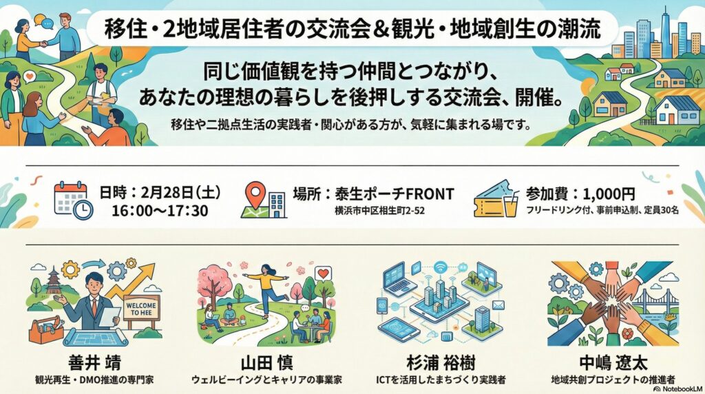 この度、「2拠点・移住ライフ大学」は、移住や二地域居住の実践者や、自分の暮らし方や働き方をシフトすることに関心がある方を対象とした「交流会・ミートアップ」イベントを開催します。