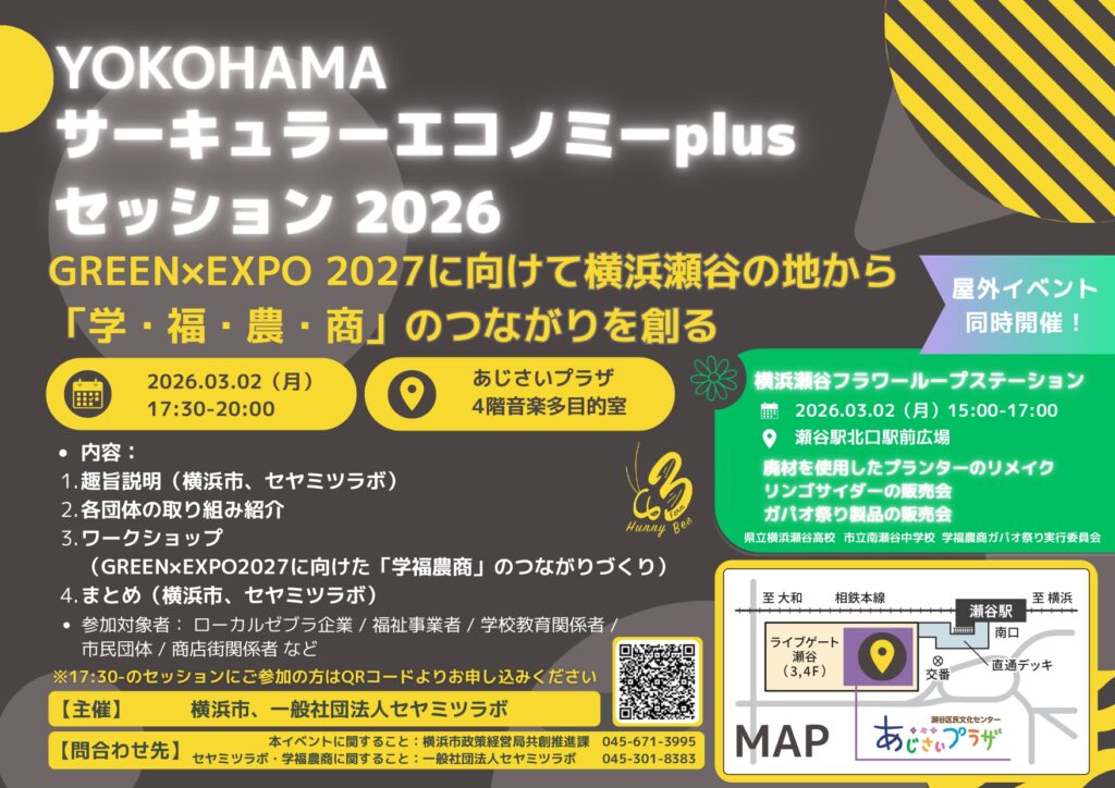 2026年3月2日(月)、横浜市と一般社団法人『セヤミツラボ』が「YOKOHAMA サーキュラーエコノミーplus セッション 2026」を開催します。会場は、瀬谷区民文化センター「あじさいプラザ」4階音楽多目的室(横浜市瀬谷区瀬谷4-4-10 ライブゲート瀬谷3階・4階)で、GREEN×EXPO 2027を見据え、横浜・瀬谷の地から「学・福・農・商」のつながりをつくることをテーマにします。同日15時00分〜17時00分には瀬谷駅北口駅前広場(横浜市瀬谷区中央3)で屋外イベントも同時開催されます。