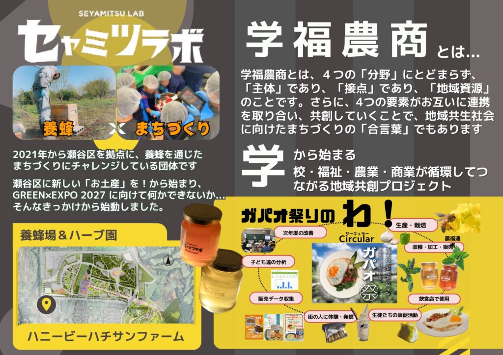 一般社団法人『セヤミツラボ』は、2021年から瀬谷区を拠点に、養蜂を通じたまちづくりにチャレンジしている団体です。瀬谷区に新しい「お土産」をつくるという発想から活動が始まり、GREEN×EXPO 2027に向けて地域で何ができるかを考える流れの中で、養蜂場やハーブ園、加工や販売、飲食店での使用、販売データの収集、子どもたちによる分析、次年度の改善といった循環の流れを作り出しています。