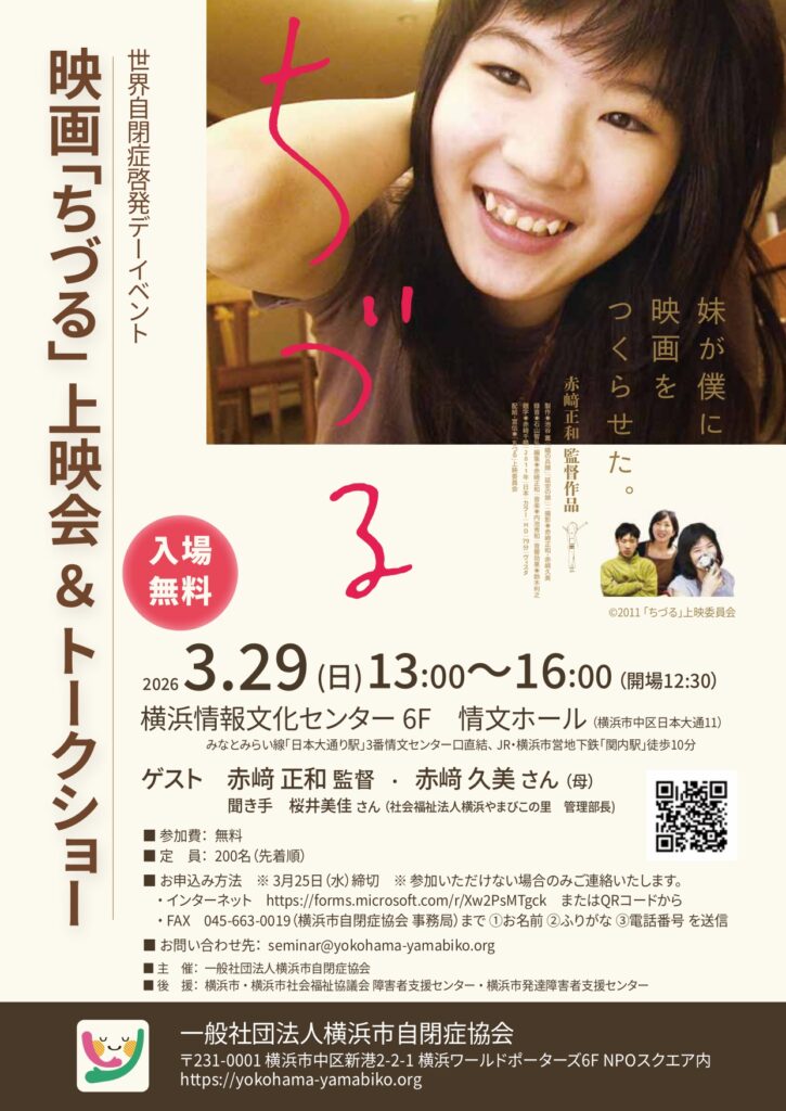 横浜市自閉症協会は2026年3月29日(日)13:00〜16:00に、映画『ちづる』の上映会とトークショーを横浜市情報文化センター6F 情文ホール(横浜市中区日本大通11)で開きます。入場は無料で、定員は先着200人です。参加には事前申し込みが必要で、申込締切は2026年3月25日(水)です。